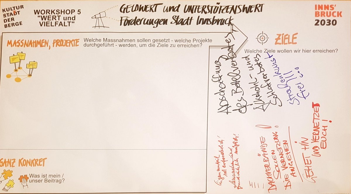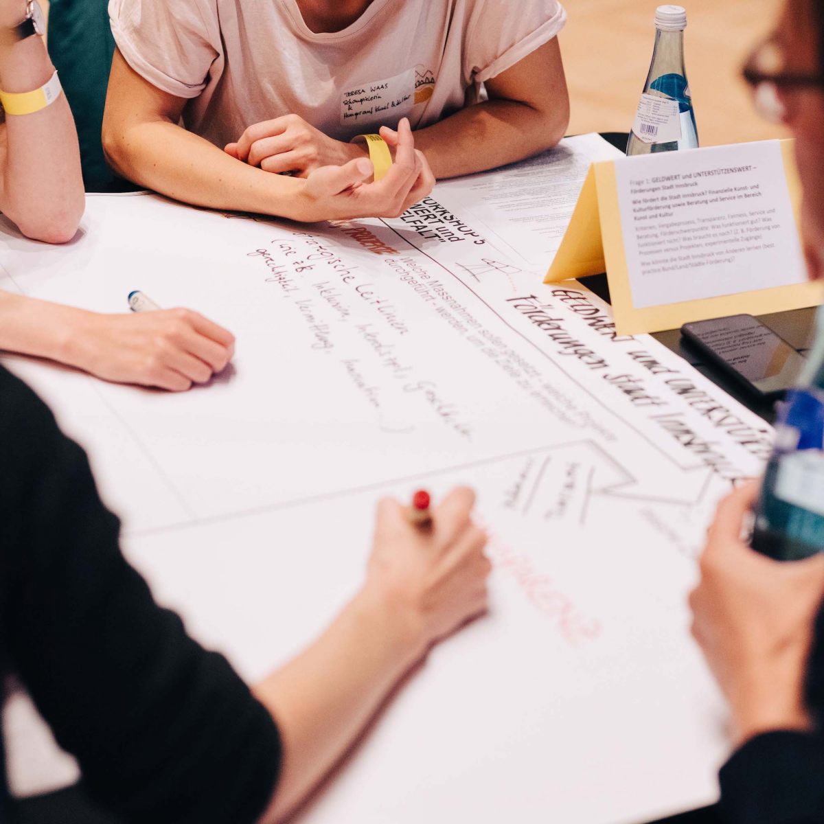 Alle Ergebnisse werden in einem nächsten Schritt von der Arbeitsgruppe und vom Projektteam intensiv diskutiert, entsprechend verdichtet und dahingehend validiert, inwieweit sie in der Kulturstrategie Innsbruck 2030 ihren Niederschlag finden sollen.